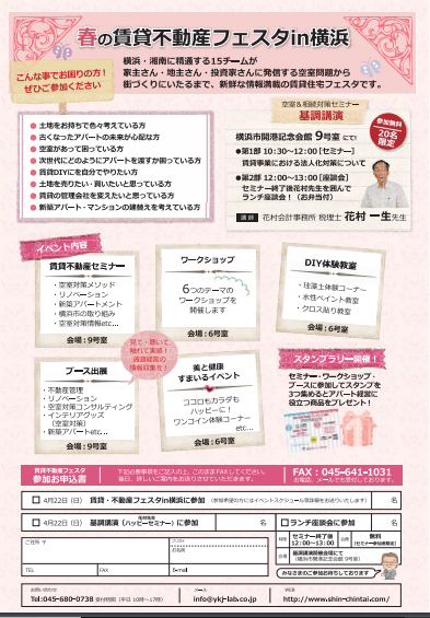春の賃貸不動産フェスタin横濱 【横濱まちづくり研究会】 春の賃貸不動産フェスタin横濱 ~横濱・湘南の空室と街並みを考えよう~ 《開催のご案内》 日時:2018年4月22日(日) 時間:10:00~16:00 会場:横浜開港記念会館(講堂・6号室・9号室) 参加無料 豪華景品が当たる抽選会のあります 横濱の街に思いを持つ仲間が集まる ワクワクする 賃貸不動産のヒントがいっぱいのフェスタです。 ▼詳しくこちらをご覧ください。 共有:Tweet 関連
